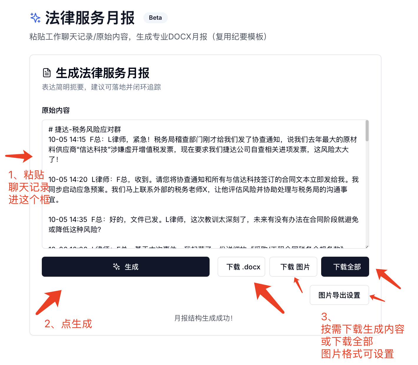 这是一款将“聊天记录/工作素材”快速沉淀为“法律服务月报”的工具。您只需粘贴当月的关键内容,系统会自动提炼“重点工作、风险、下一步、体系建设”等板块,并支持导出正式版 DOCX 与简版图片(PNG),方便对内汇报与对外呈现。