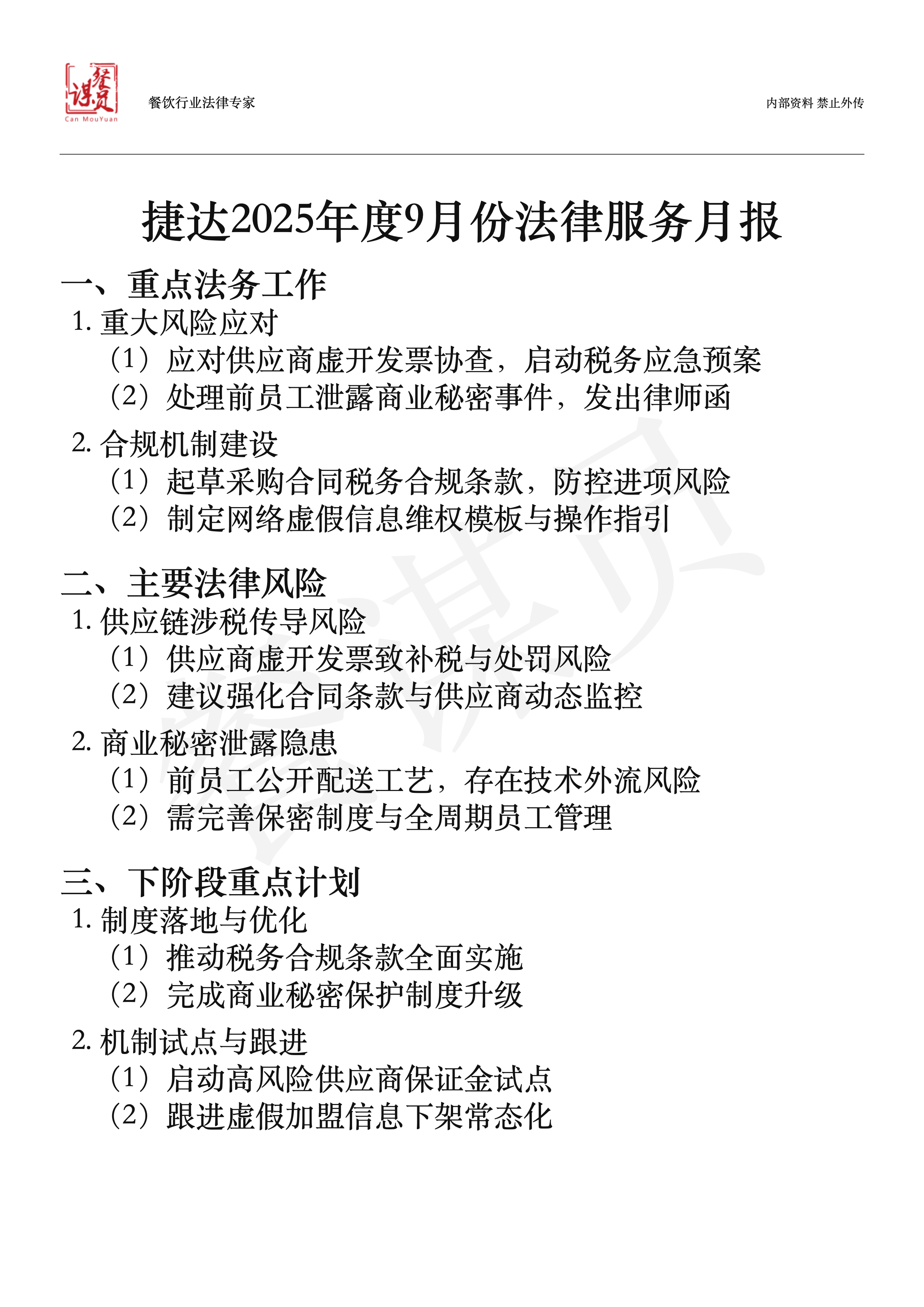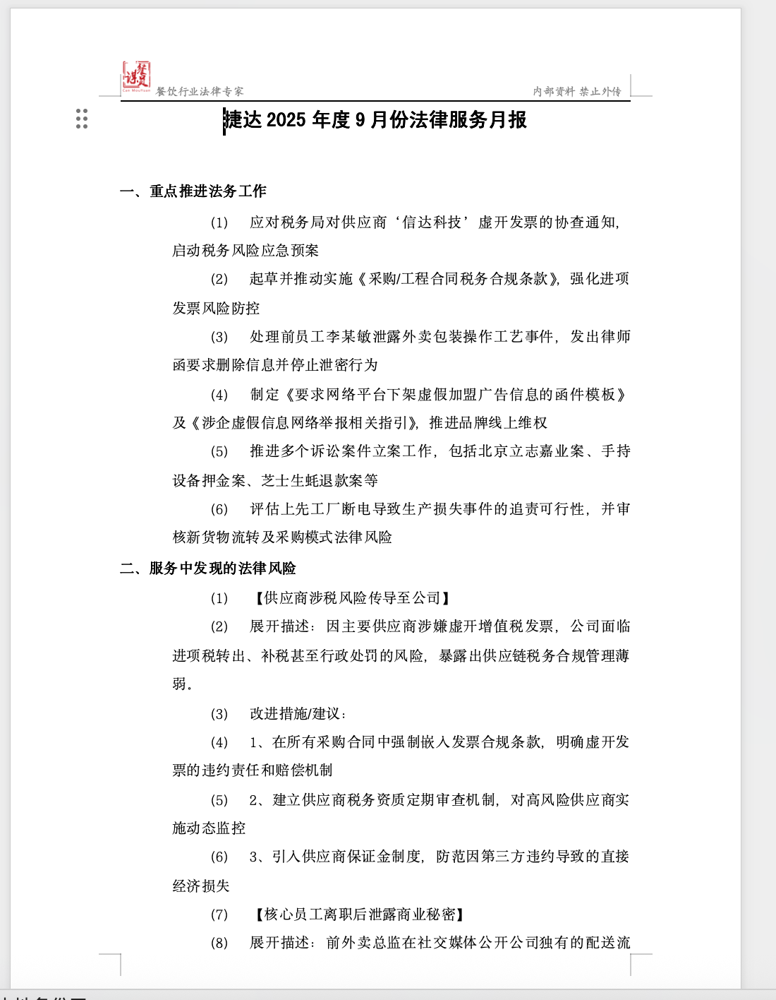 - 结构化月报:自动生成“标题、品牌/公司、年月、重点工作、法律风险及建议、下一步计划、体系性建设”等内容结构。