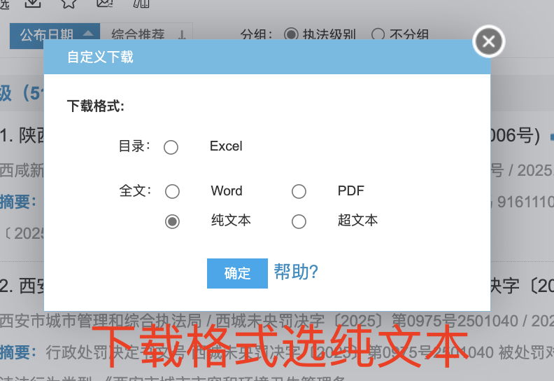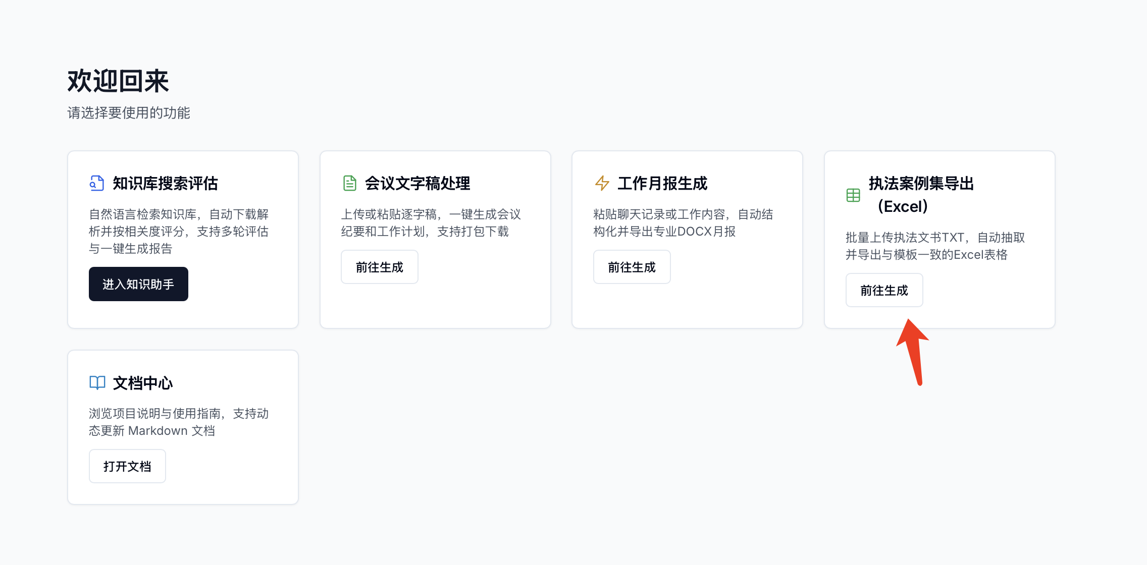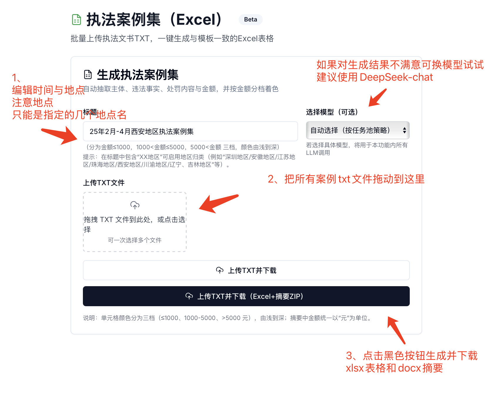- 批量整理:一次上传多份 TXT,自动识别主体、违法事实、处罚结果、金额等关键信息。