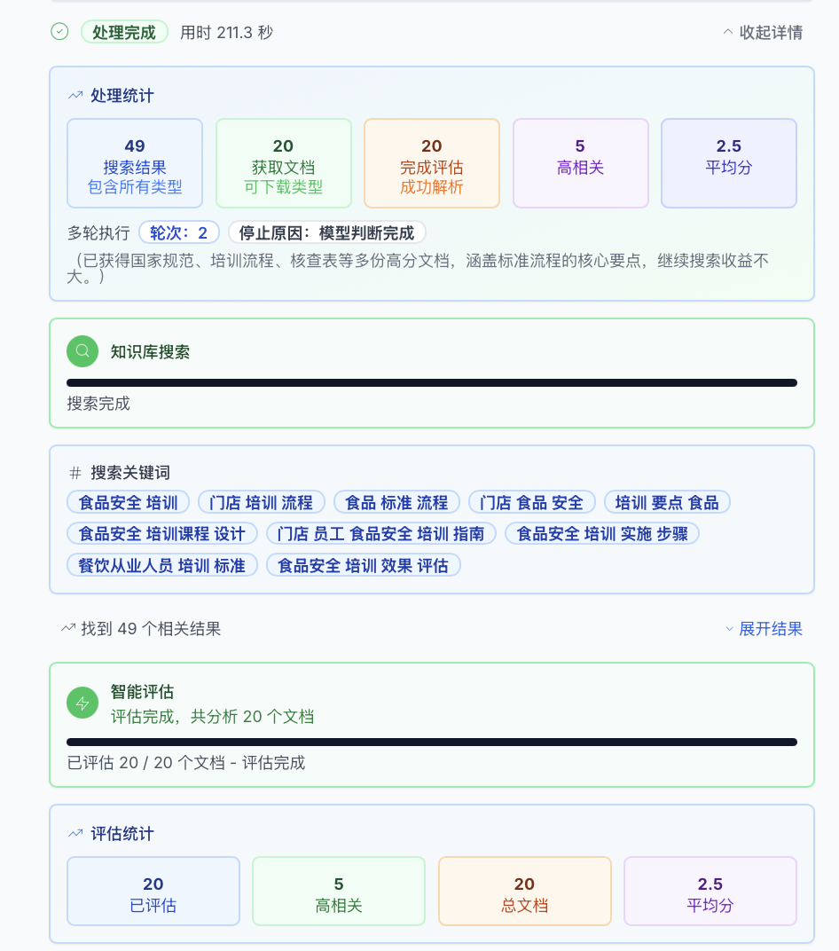 - 若结果偏多或不准,尝试:启用多轮、减小或增大单轮文档数、重写问题更聚焦。