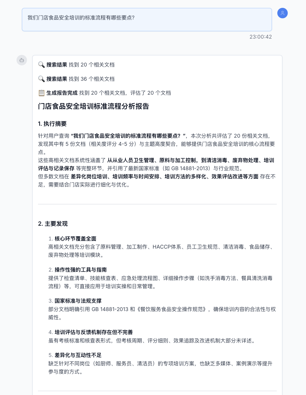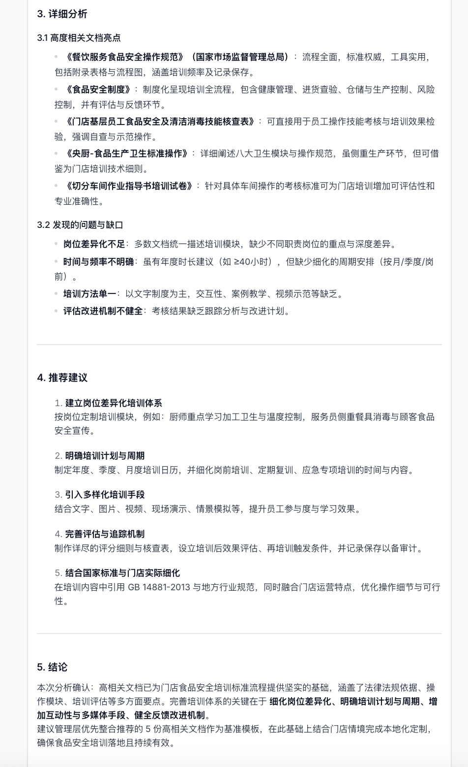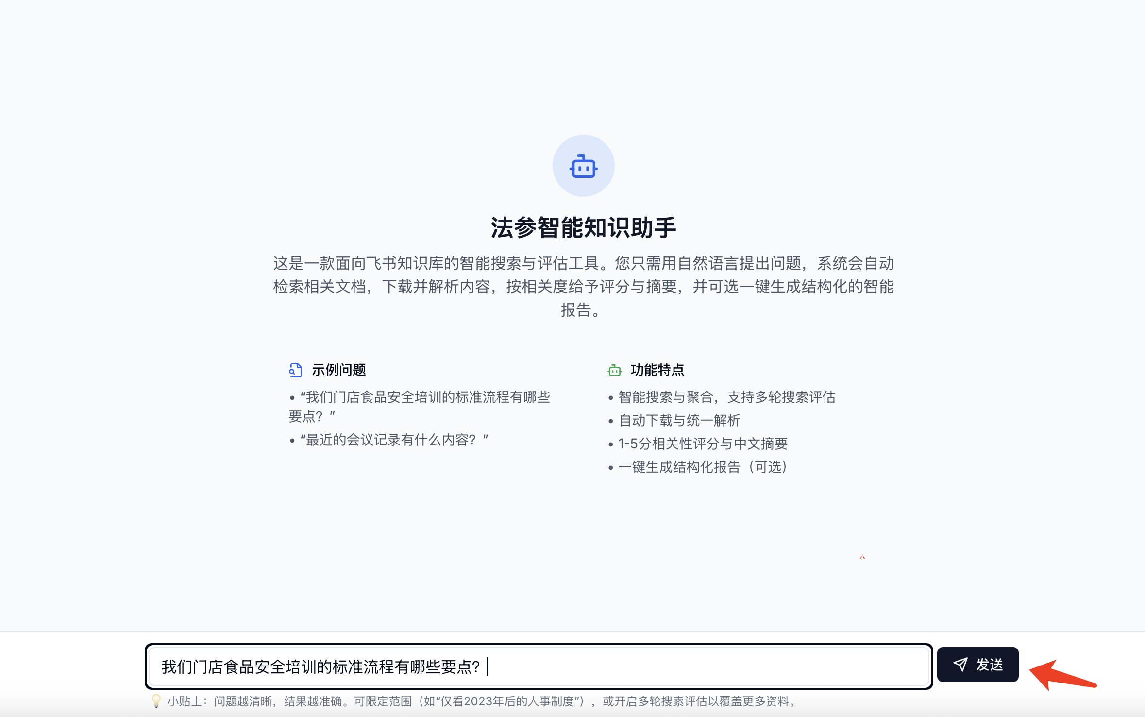 - 直接用自然语言描述你的问题或目标,例如:“我们门店食品安全培训的标准流程有哪些要点?”