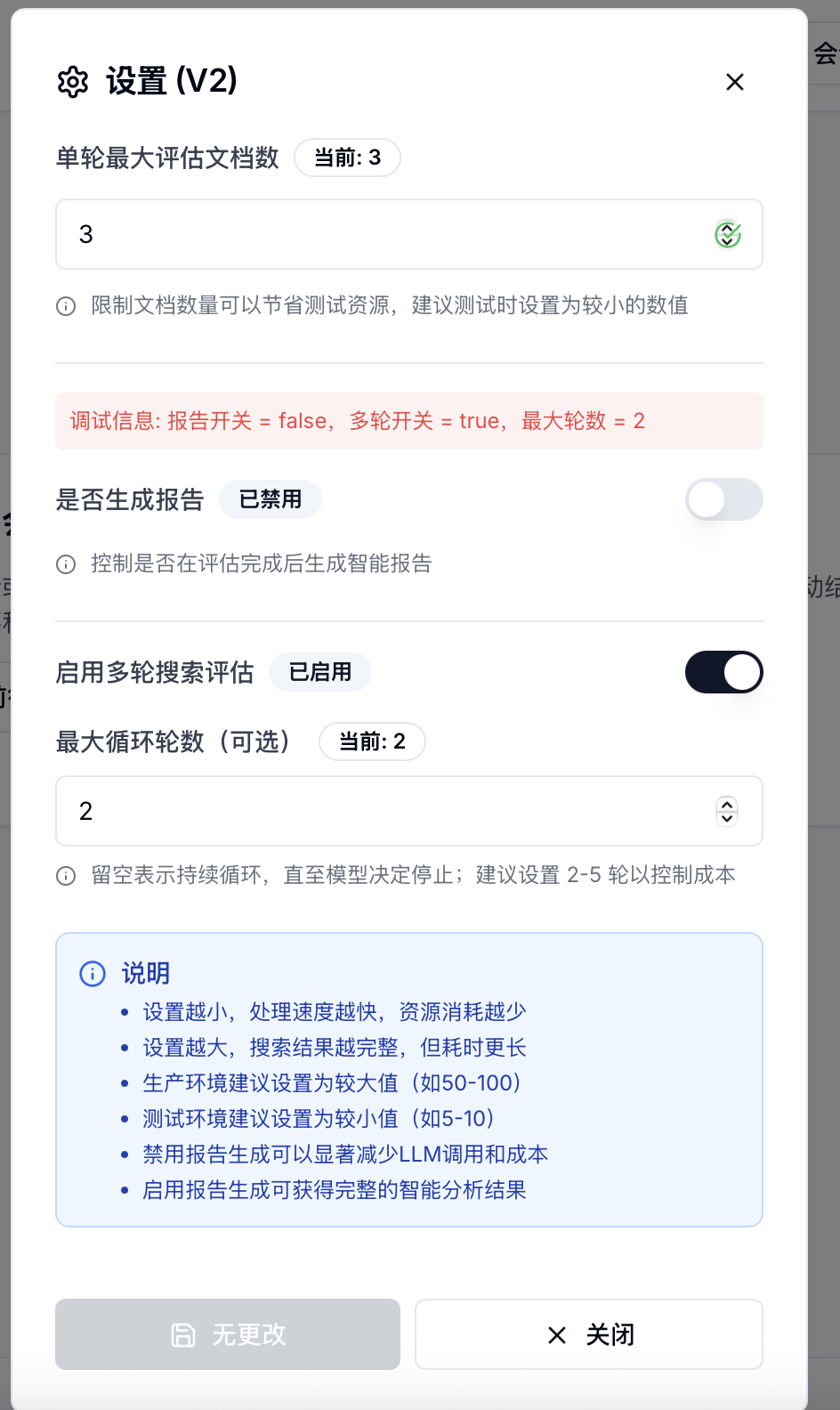 - 单轮最大评估文档数(范围建议 5-50):越大越全面,越小越高效。