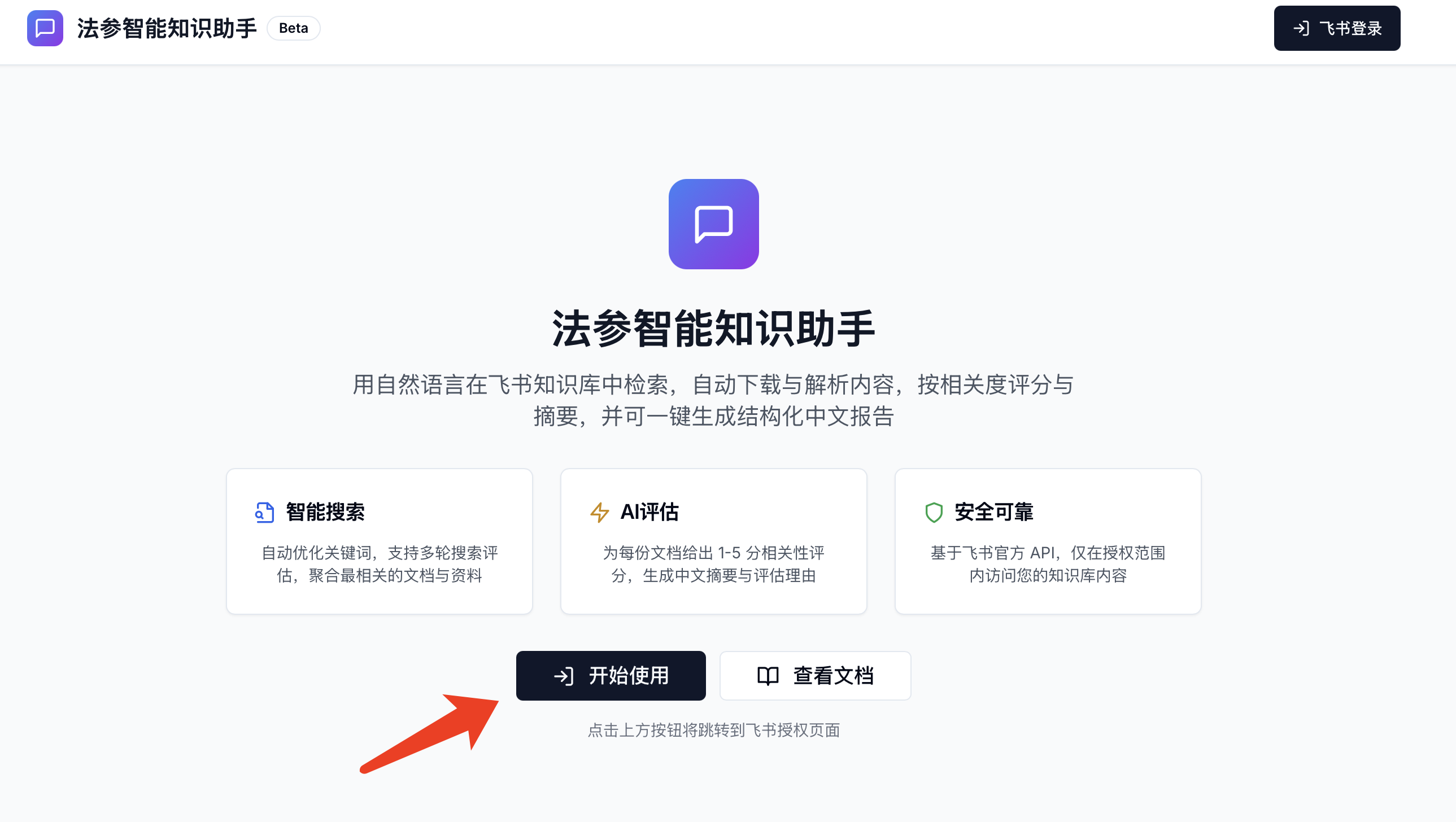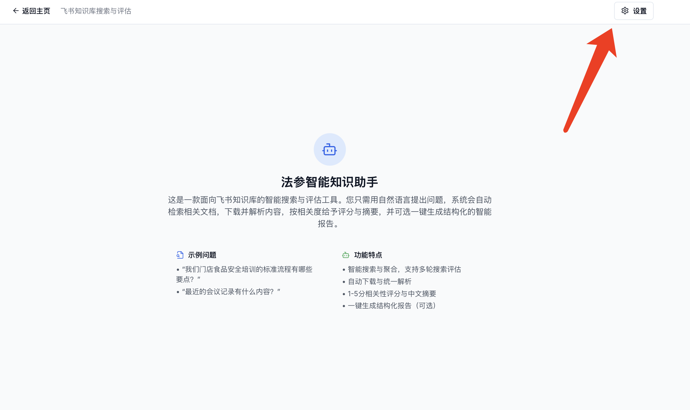 这是一款面向飞书知识库的“智能搜索与评估”工具。您只需用自然语言提出问题,系统会自动到您的知识库中检索相关文档,下载并解析内容,按相关度给予评分与摘要,并可选生成一份结构化的智能分析报告,帮助您更快定位关键资料与结论。