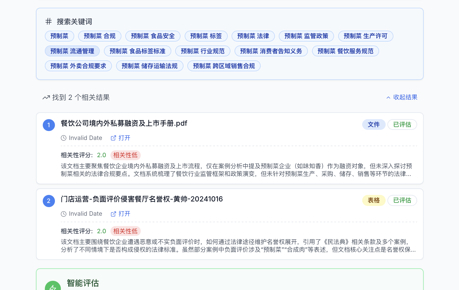 - 观察生成的关键词与评估结果,发现更偏向“商业/行业信息”,与“餐饮合规/法律规则”相关性较弱。