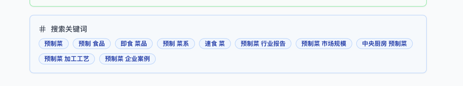 - 搜索关键词生成缺乏领域默认目的约束:当用户输入未明确目的时,模型倾向把“预制菜”理解为泛化的商业/产业话题,生成的变体偏向“行业趋势/商业信息”,而不是“餐饮合规/法律要求”。