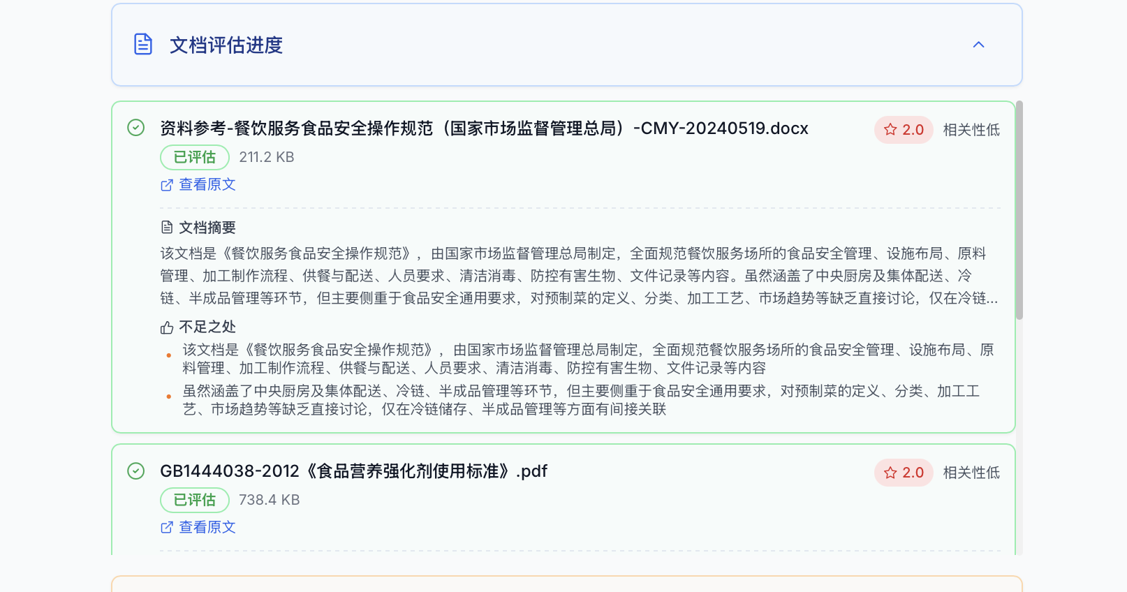 - 评估阶段未显式锚定“餐饮法务目的”:文档相关性评估与报告生成的提示未体现“服务餐饮行业、以合规/法律规则为核心”的目标,容易给非合规类文档较高评分。
